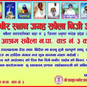 धनुषा - रामनवमीको उपल्क्षय २६ वर्षिय भण्डारा तथा साधु सत्यसङ्ग भजन किर्तन भव्य रुपमा सप्पन्न गरेको छ।धनुषाको सबैला नगरपालिका - ३ स्थित श्री सदगुरु कबिर स्थान जगह सबैला निजि आश्रम निवासको २६ वर्षिय रामनवमीको शुभ उपल्क्षयमा सगगुरु कविर आश्रम सबैला-३ को समान्वय सहयोगमा मिती गत आईवारको एक दिने साधु सत्यसंग ,भजन,भाण्डारा गराउनु भएको थियो।उक्त कार्यक्रममा सहभागीअथितीहरुलाई भोजन गराई दान दक्षिणा सहित बिदाई गरेको थियो।नव वर्ष २०८२ साल को शुभ उपल्क्षयमा देश तथा विदेशमा बस्नु हुने सम्पुर्ण साधु, संत,महन्थ बद्धिजिवी,समाजसेवीहरुमा शुख ,शान्ती, समृद्ध