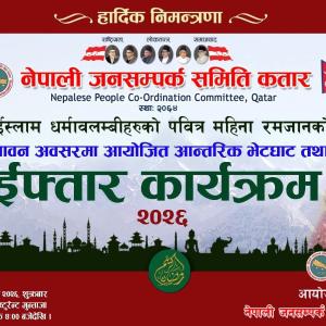 रामएकवाल राम दोहा, कतार । नेपाली जनसम्पर्क समिति कतारले अगामी शुक्रबार आन्तरिक भेटघाट तथा ईफ्तार कार्यक्रम गर्ने भएको छ। ईस्लाम धर्मावलम्बीहरुको पवित्र महीना रमजान तथा नजिकै आउँदै गरेको राष्ट्रिय पर्व ईद-उल-फित्रको पावन अवसरमा इफ्तार कार्यक्रमको आयोजना गर्न लागेका हुन। धार्मिक तथा सामाजिक सद्धभाव लागी सबै धर्म समुदायको चाड पर्वहरूलाइ मिलेर मनाउनु पर्छ भन्ने उदेश्य अनुरूप अन्य चाडपर्व संगै मुस्लिम समुदायको पवित्र महीना रमजानको रोजा राख्ने वर्तालुहरूको लागी इफतार कार्यक्रमको आयोजना गर्न लागेको समिती कतारका कार्यवाहक सभापति ठाकुर कुमार परियारले