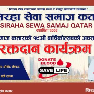 रामएकवाल राम कतार । सिराहा सेवा समाज कतारको आयोजनामा बृहत रक्तदान कार्यक्रम सप्पन्न भएको छ। शुक्रबार दोहा स्थित हमाद अस्पतालको ब्लड डोनेसन सेन्टरमा समाजको १९ औ वार्षिक उत्सवको अवसरमा नेपाली रक्तदाता संघ कतारको समन्वयमा आयोजित कार्यक्रममा ११५ जनाको उपस्थिति रहेको थियो। रक्तदानको लागी १०५ जनाले रजिष्ट्रेसन गरेका थिए जस मध्ये ४२ जनाले रक्तदान गर्न सफल भएको समाजका अध्यक्ष जयप्रकाश यादवले जानकारी दिए। रक्तदान नै जीवन दान हो भन्ने यस मानवीय तथा परोपकारी" कार्यमा सहभागी भइ रक्तदान गरेका सम्पूर्ण रक्तदाताहरूलाई प्रश
